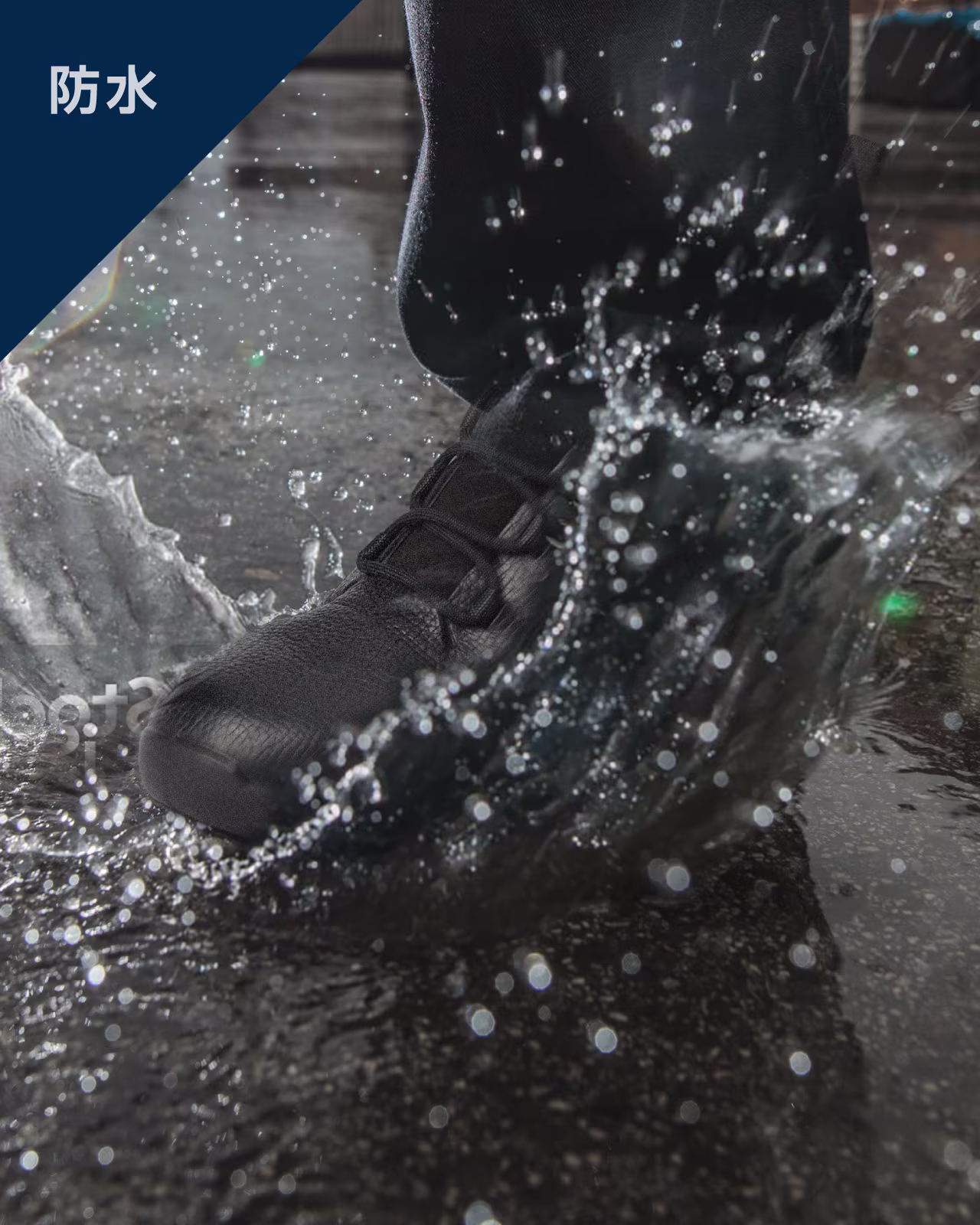 雨をシャットアウト ゴアテックス フットウェア最大の機能、耐久防水性。雨水の浸入を防ぎ、ウェットな路面でも靴内の心地よさをまもります。
